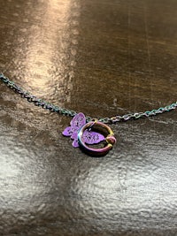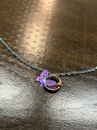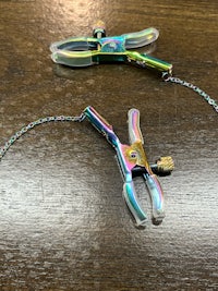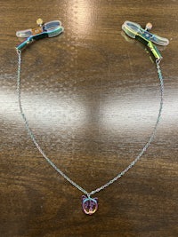 Hand made with a delicate Stainless steel, spring handled nipple clams. Rainbow ionized chain with a small purple butterfly charm.