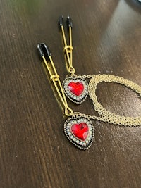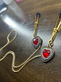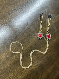 Hand made Stainless steel, nickel free gold rubber tipped nipple clamps with encrusted red heart charms